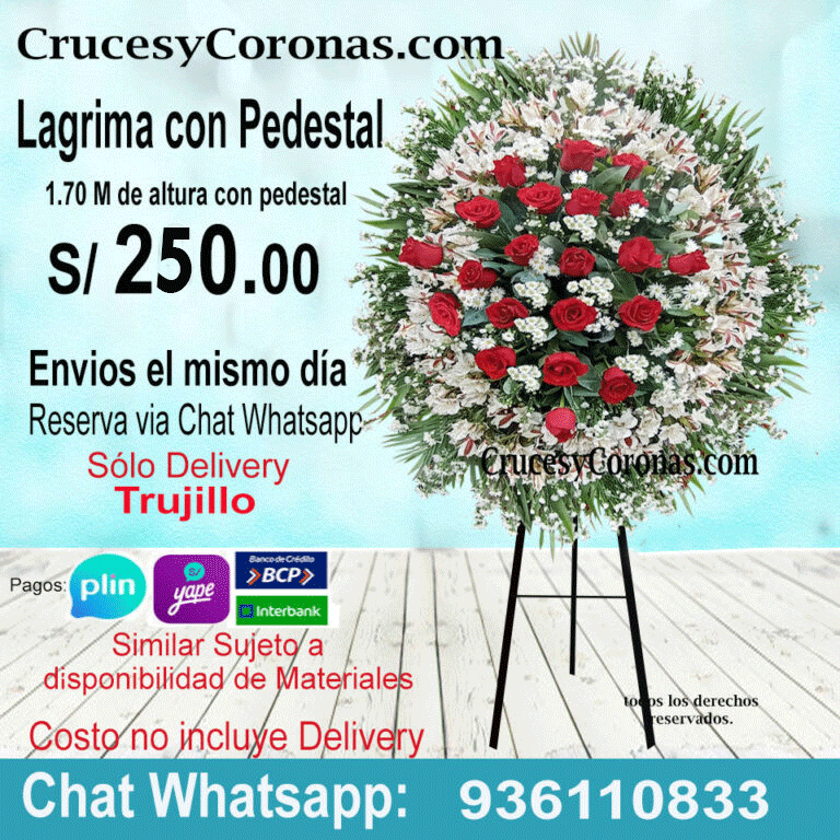 Florerias en Trujillo, corona de condolencias a trujillo, tarjeta dedicatoria impresa, Delivery  el mismo día, reserva en Chat Whatsapp 936110833, Transferencia para envíos en Trujillo. BCP, INTERBANK, YAPE ,PLIN, Solicita via Chat Whatsapp 936110833. florerias en trujillo delivery